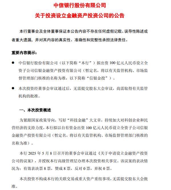 财经5月9日讯 昨日,中信银行发布公告显示,中信银行拟出资100亿元设立全资子公司信银金融资产投资有限公司(暂定名,将以有关监管机构、市场监督管理部门核准的名称为准。本次投资经董事会审议通过后,无需提交股东大会审议,尚需取得有关监管机构的批准。