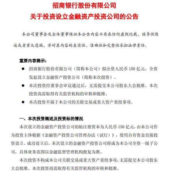 财经5月9日讯 昨日,招商银行发布公告显示,招商银行拟出资150亿元,全资发起设立金融资产投资公司。成功设立后,本次设立的金融资产投资公司将成为招商银行全资一级子公司,具体业务范围以金融监督管理机构批复为准。本次投资尚需取得有关监管机构的审核和批准。