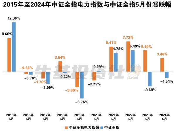 复盘了过去10年的指数涨跌幅数据,发现中证全指电力指数有8个年度的5月份涨跌幅超越中证全指同期涨跌幅。