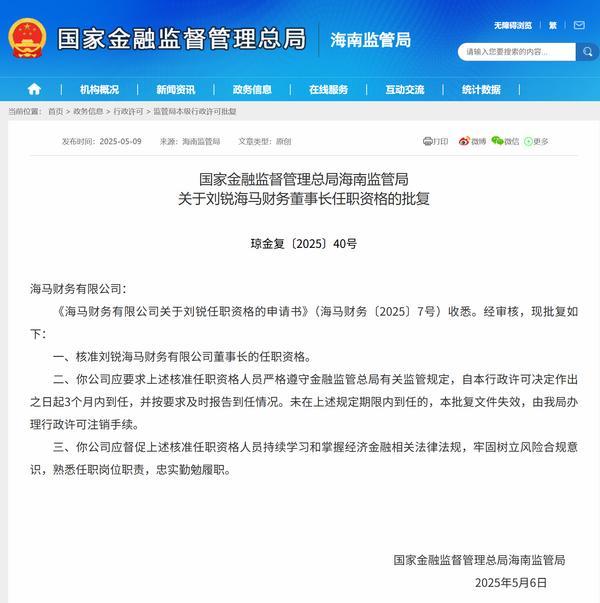 财经5月9日讯 今日,国家金融监督管理总局海南监管局公布相关批复信息,核准刘锐海马财务有限公司(简称“海马财务”董事长的任职资格。以下是相关批复正文: