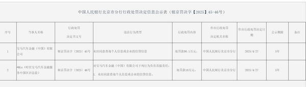 同时,时任宝马汽车金融服务中国区IT总监因对宝马汽金上述违规负有直接责任,被中国人民银行北京市分行处罚款10万元。以下是相关行政处罚决定信息公示表:
