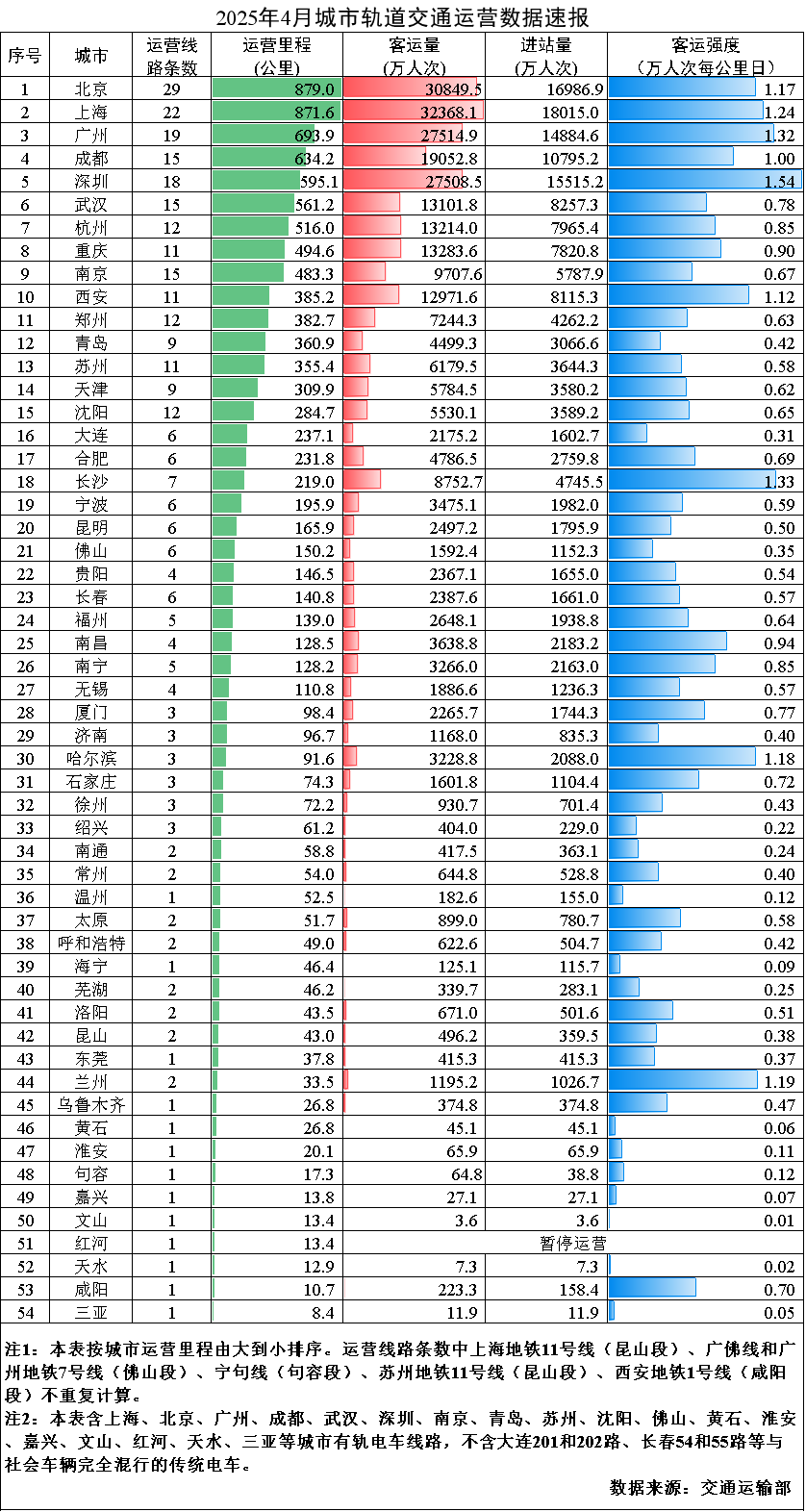 据交通运输部微信公众号消息,2025年4月,31个省(自治区、直辖市和新疆生产建设兵团共有54个城市开通运营城市轨道交通线路326条,运营里程10975.8公里,实际开行列车361万列次,完成客运量28.5亿人次,进站量17.0亿人次。4月份,客运量环比减少0.3亿人次,减少1.0%,同比增加0.9亿人次,增加3.3%。4月份全国总运营里程的平均客运强度为0.865万人次每公里日,环比增加2.1%,同比减少3.5%。本月无新开通线路。