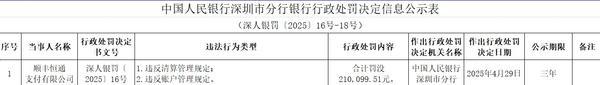 财经5月13日讯 中国人民银行深圳市分行5月9日公示的行政处罚信息显示,顺丰恒通支付有限公司(简称“顺丰支付”因"违反清算管理规定、违反账户管理规定"两项违规行为,被合计罚没21万元。