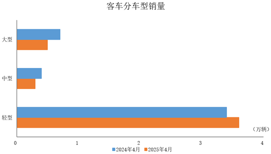 2025年1-4月,客车产销均完成16.9万辆,同比分别增长5.9%和6.9%。在客车细分品种中,与上年同期相比,轻型客车产销小幅增长,中型客车产量微增、销量微降,大型客车产销呈不同程度下降。