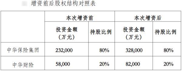 公告显示,本次增资向中华保险集团和中华财险定向增发人民币普通股120,000万股,其中向中华保险集团定向增发96,000万股,向中华财险定向增发24,000万股;增资价格为1元人民币/股,此次增资共募集资金人民币120,000万元,增资后股东持股比例不变。本次增资无新增股东。