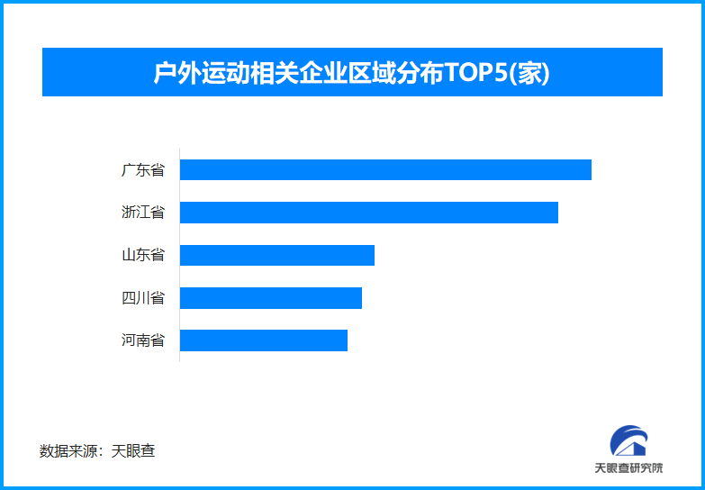 从区域分布来看,广东省、浙江省、山东省户外运动相关企业数量位居前列,三个省市数量总和超过10.4万余家,占企业总数的31.1%。