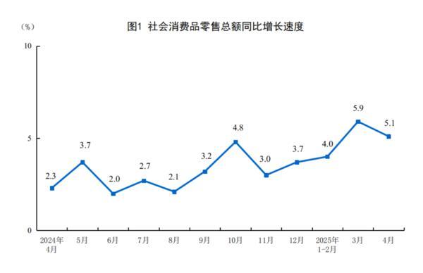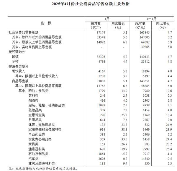 按消费类型分,4月份,商品零售额33007亿元,同比增长5.1%;餐饮收入4167亿元,增长5.2%。1—4月份,商品零售额143651亿元,增长4.7%;餐饮收入18194亿元,增长4.8%。