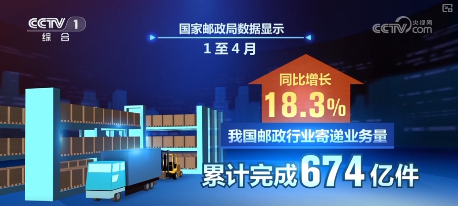 国家邮政局数据显示,1至4月,我国邮政行业寄递业务量累计完成674亿件,同比增长18.3%。其中,快递业务量累计完成614.5亿件,同比增长20.9%。