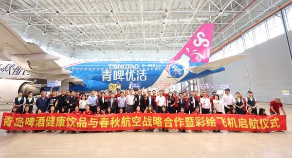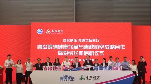 2025年5月16日,青岛啤酒健康饮品携手春秋航空,彩绘飞机首航仪式暨战略合作签约礼在上海虹桥公务机基地举行。青岛啤酒集团副总裁王少波、青岛啤酒集团健康饮品事业部总经理王凯与春秋航空党委书记兼副总裁张武安、春秋航空市场部总经理郑连刚以及春秋文化传媒总经理陈俊华等领导嘉宾共同出席活动。