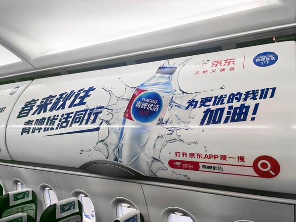 青啤优活与春秋航空携手合作,将品牌视觉与航空特色深度融合。机身C位,“青啤优活”四个大字醒目亮眼,品牌LOGO巧妙融入其中,灵动的水花绽放在机尾,图案与线条相互交织,形成极具辨识度的视觉标识。步入机舱,头片、舷窗、小桌板、行李板等位置,同样布满品牌元素与趣味标语,“春来秋往,青啤优活同行”、“优活来一瓶,活力每一程!”,让旅客从登机开始,就能沉浸在青啤优活的活力氛围中。