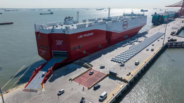 出口汽车在苏州港太仓港区码头集中装载上“深圳号”汽车运输船(2025年4月26日摄,无人机照片。新华社发(王须中摄