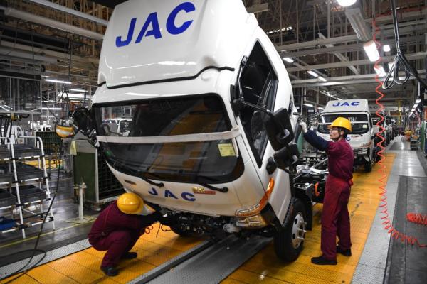 工人在江淮汽车新港基地轻卡生产线上忙碌(2023年2月8日摄。新华社记者 刘军喜 摄