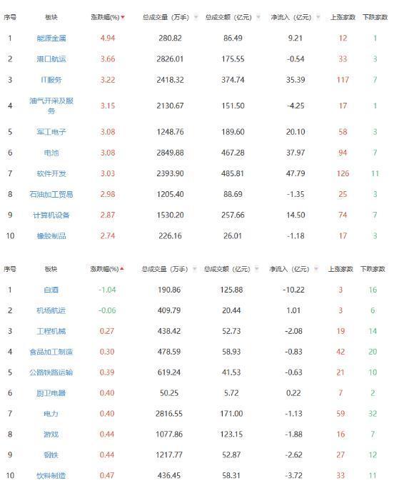 行业板块方面,能源金属、港口航运、IT服务、油气开采及服务等板块涨幅居前,白酒、机场航运板块跌幅居前。
