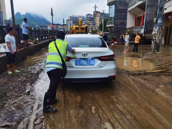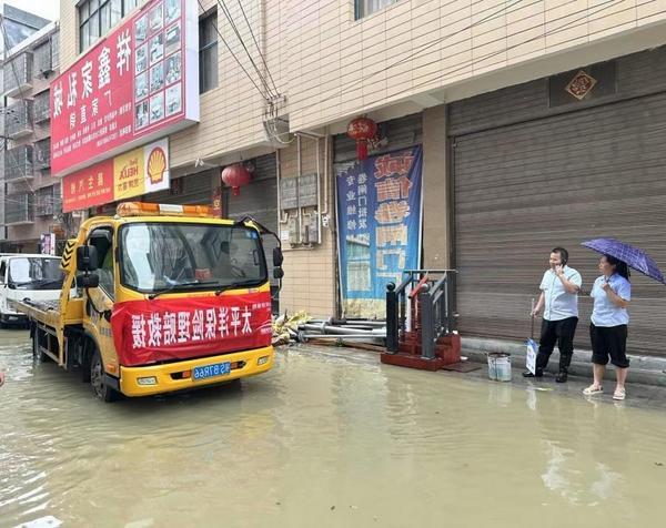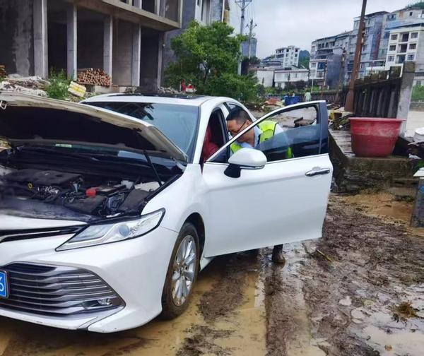 到达现场时,焦急的车主刘先生快步上前:“车子发动不了,这可怎么办呀?”姜鹏程一边轻声安抚,一边迅速排查周边安全隐患。确认群众全部转移后,他毫不犹豫踏进泥水里,奋力一步一步将被困车辆推出积水区。随后,中国太保专属救援车接力,将车辆安全送往修理厂。