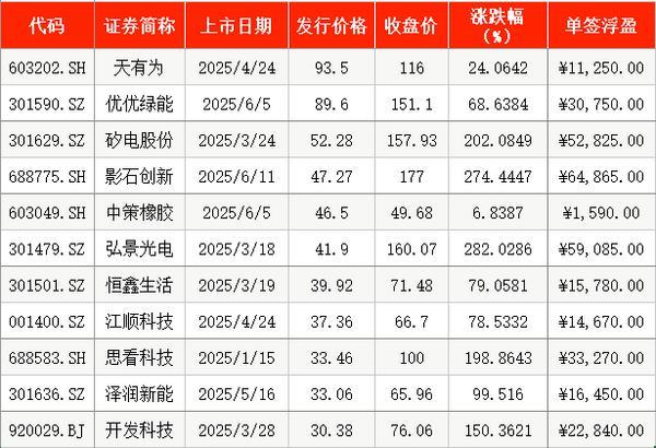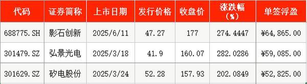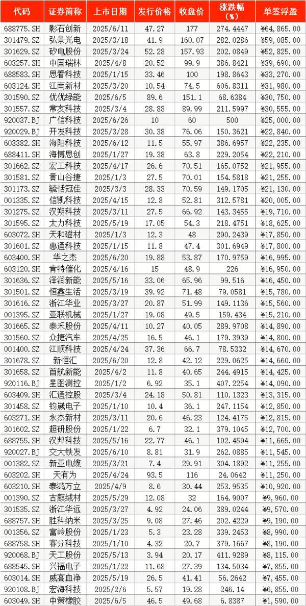 2025年上半年上市的新股中,有1只新股的首日收盘单签浮盈超过6万元,有2只单签浮盈超过5万元。