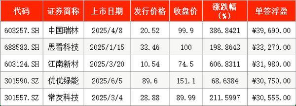 与此同时,中国瑞林(603257、思看科技(688583、江南新材(603124、优优绿能(301590、常友科技(301557等5只新股,首日单签浮盈均超过3万元。