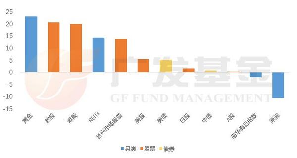 在各类主要资产中,年初以来涨幅超过10%的分别是:黄金(23.09%、欧洲股市(20.67%、港股(20%、REITs(14.21%。不过,它们大涨背后的原因各有不同。