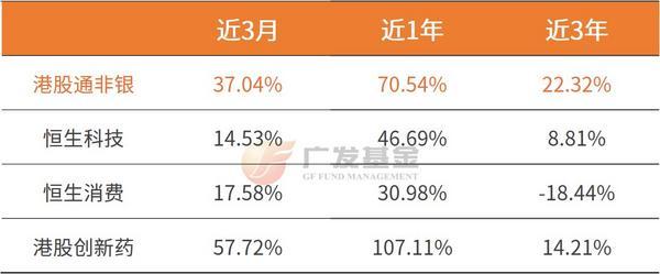 以中证港股通非银行金融主题指数(简称“港股通非银”,代码931024.CSI为例,截至7月9日,该指数近3月上涨37.03%,近1年上涨70.54%,跑赢同期的恒生科技及恒生消费指数;即使从3年的维度来看,指数也上涨了22.32%,同样超越了同期科技、消费、创新药等指数的表现。