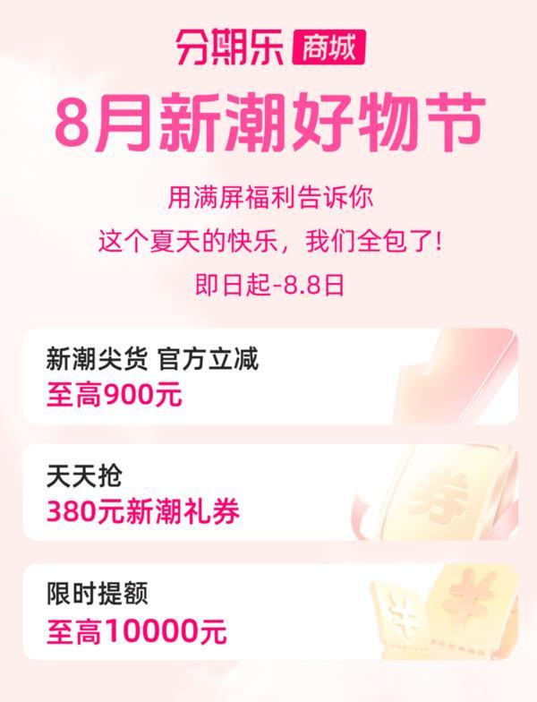 乐信旗下分期乐商城上线“新潮好物节”,自8月1日开始至8日结束,为期8天。本次“新潮好物节“聚焦数码装备、清凉家电、七夕礼盒等品类,以全品类通用满减券、会员专享券、定向加码单品类满减券、头部爆款官方补贴的组合优惠全面激发年轻消费活力,助力暑期消费市场升温。