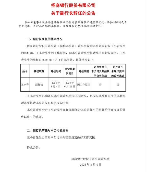 招商银行:副行长王小青因工作原因辞任巴适游戏网• 2025-08-05 10:04:45•快讯•阅读 1153 财经8月5日讯 8月4日,招商银行发布公告称,该行董事会收到副行长王小青的辞任函。王小青因工作原因,向招商银行董事会提请辞去副行长职务。王小青的辞任自2025年8月4日起生效。 标签: 银行/ 银行年中工作会议密集召开 擘画下半年高质量发展蓝图 上一篇2025-08-05四部门出手!医疗科普不是“流量生意”下一篇 2025-08-05相关推荐 “内部人员”可办“靓号”?起底代办车牌套路购置新车,谁都希望能有一组心仪的车牌号,而除了正常选号,也有人试图托这样那样的“内部关系”,办到一张所谓的“靓号车牌”>>>2025-08-05 10:04:45583 2025善议论坛:江南布衣携手 Spiber 以未来纤维重启时尚新纪元随着越来越多品牌、科技企业与平台加入这一进程,下一代材料供应链的重塑必将加速推动时尚产业迈向一个更加绿色与可持续的新纪元。2025-08-05 10:04:45359 青小云带您解码青云店:一座现代小镇的生机美视频无法播放,请升级浏览器至最新版。2025-08-05 10:04:451777 司法部发布规范涉企行政执法专项行动第二批典型案例贵州某县政府行政执法监督局针对县交警大队辅警独立执法的问题,明确执法辅助人员与正式执法人员的权责边界,杜绝辅助人员独立执法。 针对涉企检查“频次过高、重复2025-08-05 10:04:45826 新版室外健身器材安全国家标准近日实施 一图看懂十二个变化新版《室外健身器材的安全通用要求》新增总体要求、绿色环保和可回收材料要求、载荷计算方法等内容,并增加了适老化和适儿化要求,突出对“一老一小”的关爱。2025-08-05 10:04:451932 逆势向上!中国外贸增速逐季加快着眼细分数据,外贸“稳中向好”的“面貌”更加清晰,抗压抗逆能力进一步显现。 从季度看,增速逐季加快。从一、二季度分别增长1.3%、4.5%,到三季度增长6%,我国进出口已2025-08-05 10:04:45104 我国首份城市综合发展指数报告发布 北京、深圳、上海综合排名前三综合评估结果显示:我国城市高质量可持续发展呈现“头部引领、整体向好”的良好态势。北京、深圳、上海位居综合排名前三。 综合评估结果显示:我国城市高质量可持续2025-08-05 10:04:45918 李正斌获批担任中铁信托总经理中国网财经10月13日讯 今日,四川金融监管局公布相关批复,核准李正斌中铁信托有限责任公司总经理的任职资格。以下是相关批复正文: 公开资料显示,中铁信托是经国家金融2025-08-05 10:04:45718