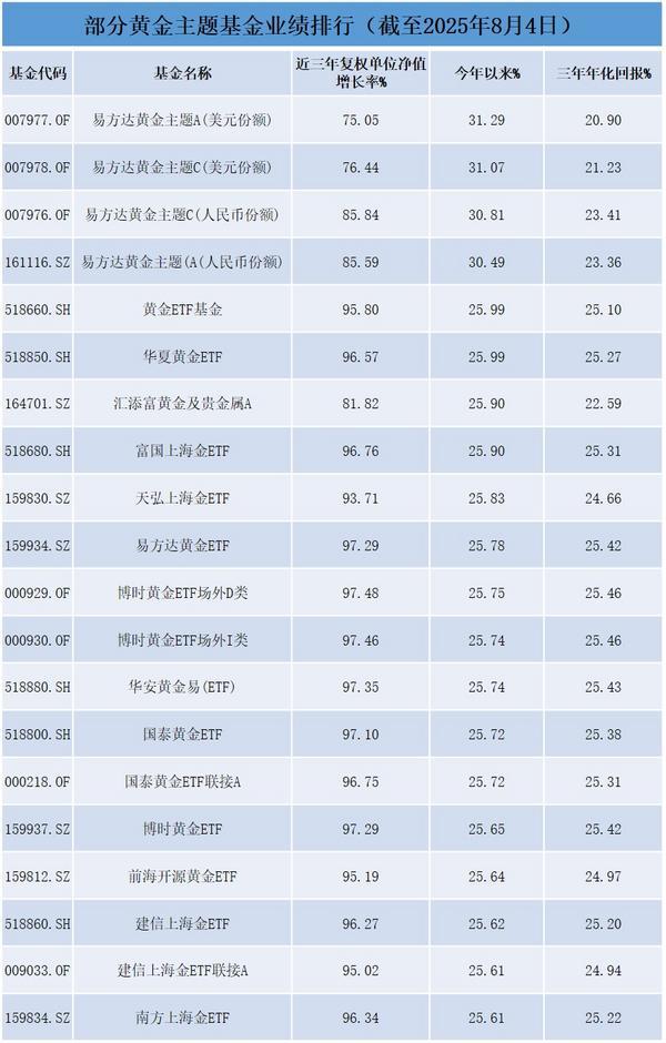 同花顺iFinD数据显示,截至8月4日,包括黄金主题QDII基金和黄金ETF在内,年内黄金主题基金平均涨幅25.33%,易方达黄金主题4类份额年内涨幅均已超30%,涨幅最小的也在23%以上,平均业绩傲人。另据数据显示,成立满三年的46只黄金主题基金近三年平均涨幅已高达89.98%,黄金主题基金三年年化回报在20%至25%之间,近三年平均业绩远超其他各类型基金。