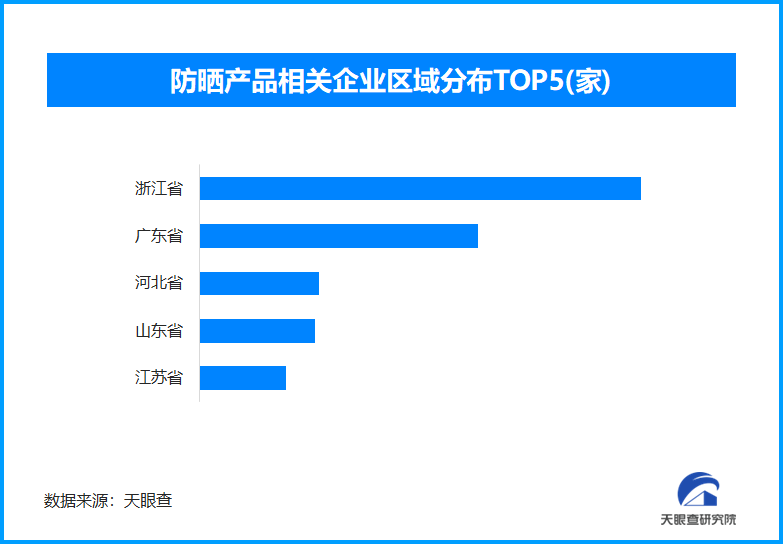 天眼查专业版数据显示,截至目前我国现存在业、存续状态的防晒产品相关企业超4300家。从区域分布来看,浙江省、广东省防晒产品相关企业数量位居前列,两个省市数量总和超过1900家,占企业总数的43.86%。