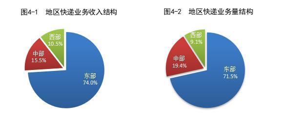 1-7月,东、中、西部地区快递业务收入比重分别为74.0%、15.5%和10.5%,快递业务量比重分别为71.5%、19.4%和9.1%。与去年同期相比,东部地区快递业务收入比重下降0.8个百分点,快递业务量比重下降1.4个百分点;中部地区快递业务收入比重上升0.5个百分点,快递业务量比重上升0.9个百分点;西部地区快递业务收入比重上升0.3个百分点,快递业务量比重上升0.5个百分点。