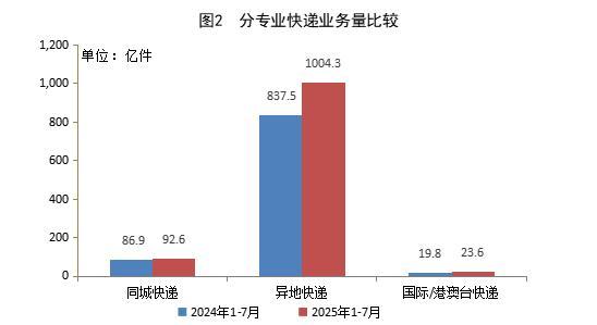 1-7月,同城快递业务量累计完成92.6亿件,同比增长6.5%;异地快递业务量累计完成1004.3亿件,同比增长19.9%;国际/港澳台快递业务量累计完成23.6亿件,同比增长19.2%。