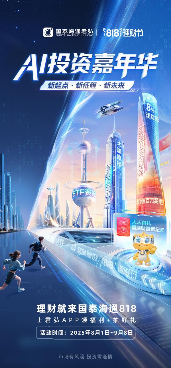 以国泰海通首届818理财节为契机,国泰海通推出证券行业首个全AI智能APP国泰海通灵犀,服务行业最大规模客户基数,面向更广阔客户群体打造智能财富管理新体验,深度融合大模型技术与君弘智投服务体系,以AI技术创新应用引领券业智能服务模式变革。倾力打造证券行业财富管理领域首个“AI投资嘉年华”,立足公司综合财富管理体系化竞争优势,打造一场专业化、智能化、普惠化的财富管理盛宴,以AI技术驱动服务范式升级深入践行普惠金融。8月18日精彩呈现“财经联播10小时,智投AI新质力”特别节目,汇聚顶尖投研、投顾、资配专业力量,与投资者共赴一年一度的818理财节之约,深度解码AI时代财富新范式。