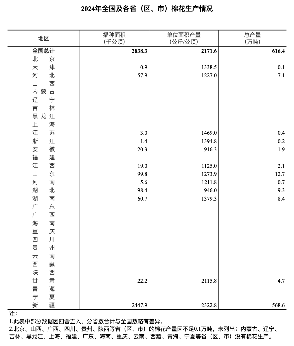 根据对全国31个省(区、市的统计调查(新疆棉花播种面积通过遥感测量取得,2024年全国棉花播种面积、单位面积产量和总产量分别如下: