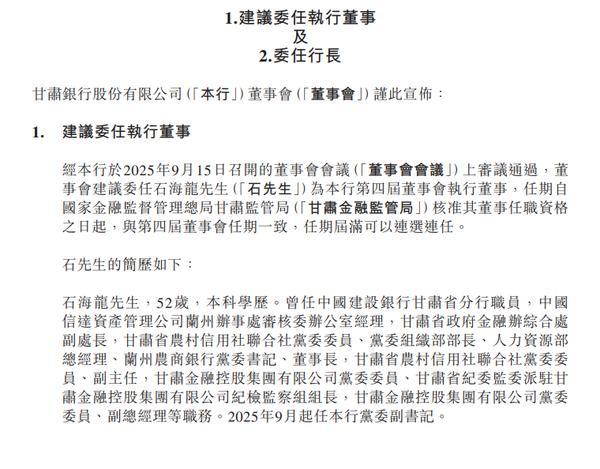 上述公告还显示,经董事会会议审议通过,董事会同意委任石海龙担任甘肃银行行长,任期自其行长任职资格获得甘肃金融监管局核准之日起,至第四届董事会届满为止。同时,经董事会审议通过,自2025年9月15日起至石海龙高级管理人员任职资格获得甘肃金融监管局核准之前,石海龙代为履行该行行长职责。