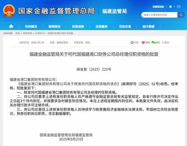 财经9月30日讯 昨日,福建金融监管局公布相关批复,核准何代国福建省港口集团财务有限公司(简称“福建港口财务公司”总经理的任职资格。以下是相关批复正文: