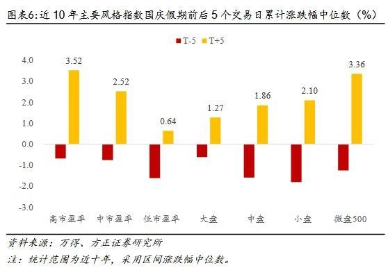 “同时,高市盈率、中市盈率、低市盈率指数节后5个交易日累计涨跌幅中位数分别为 3.52%、 2.52%、 0.64%。大盘、中盘、小盘指数节后5个交易日累计涨跌幅中位数分别为 1.27%、 1.86%、 2.10%。”方正证券指出。