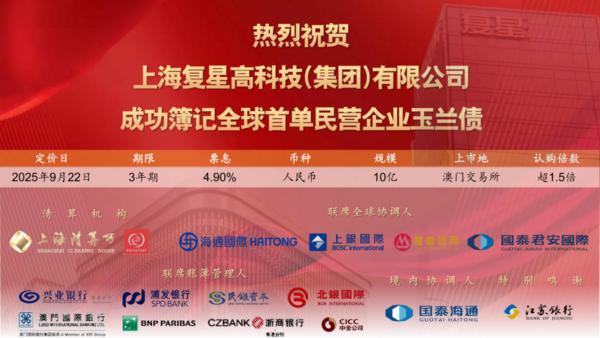 近日,厦门国际银行支持复星国际旗下上海复星高科技(集团有限公司上海清算所发行全球首单民营企业“玉兰债”,发行规模10亿元、期限3年,并将在澳门交易所上市。