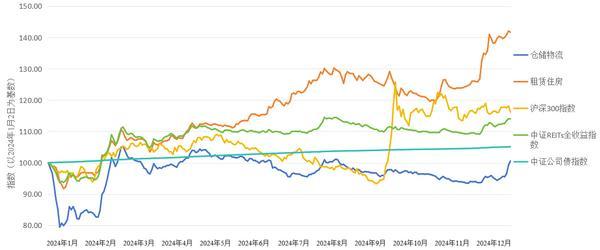 图5:仓储物流、租赁住房与中证REITs全收益、沪深300及中证公司债指数对比(2024年度
