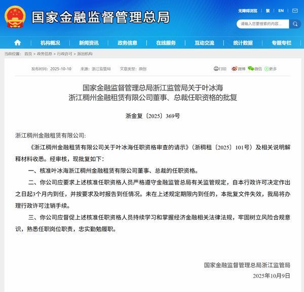 以下是相关批复正文: 公开资料显示,稠州金租成立于2016年9月,是经中国银保监会批准主营融资租赁业务的金融机构,是浙江省内(不含宁波)首家银行系金融租赁公司。公司注