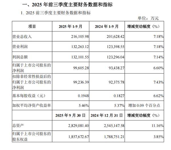 财经10月20日讯今日,陕国投信托(证券代码:000563.SZ,证券简称:陕国投A发布2025年前三季度业绩快报显示,2025年前三季度陕国投信托实现营业总收入21.61亿元(216,105.98万元,同比增长7.18%;实现营业利润13.23亿元(132,263.12万元,同比增长7.18%;实现利润总额13.21亿元(132,101.55万元,同比增长7.14%;实现净利润9.96亿元(99,605.28万元,同比增长6.60%;扣除非经常性损益后的归属于上市公司股东的净利润9.92亿元(99,236.39万元,同比增长7.43%;基本每股收益0.1948元,同比增长6.62%。