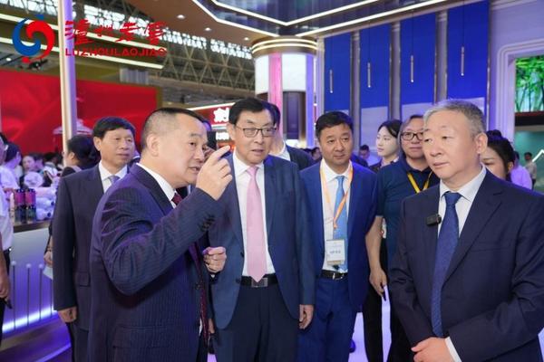(泸州老窖集团(股份公司党委书记、董事长刘淼(左向参展嘉宾第十二届全国政协副主席马培华(中,中国酒业协会理事长宋书玉(右介绍展品