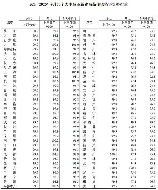 “金九”楼市数据出炉。10月20日,国家统计局发布9月份70个大中城市商品住宅销售价格变动情况。数据显示,9月份,70个大中城市中,各线城市商品住宅销售价格环比下降,同比降幅继续呈收窄态势。