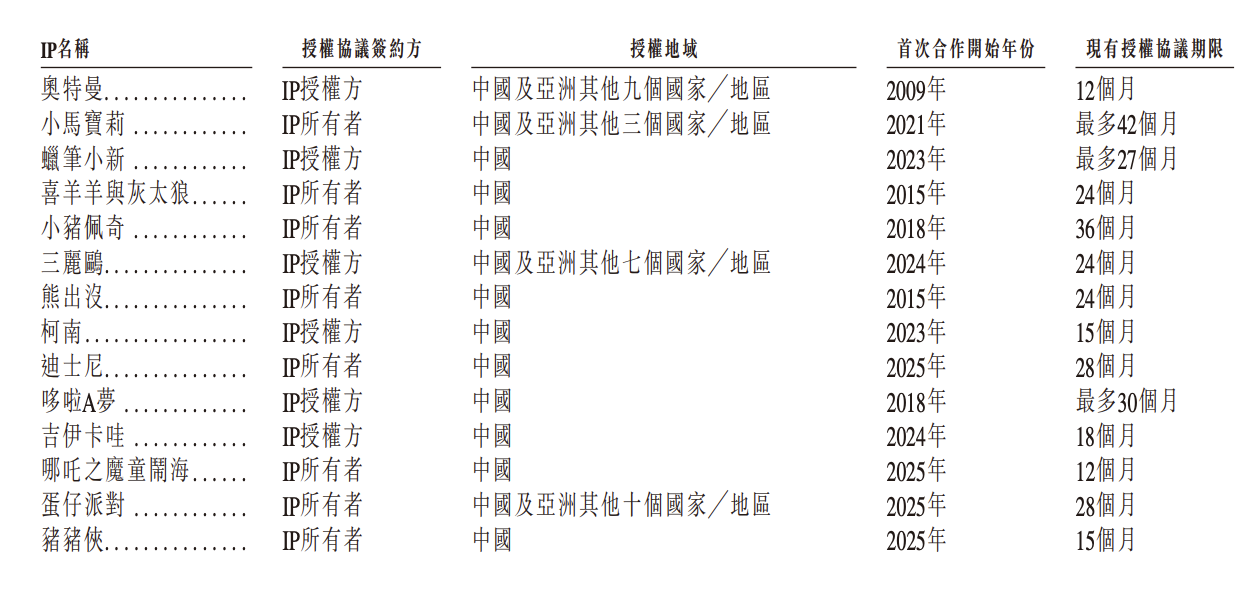 金添动漫表示,大部分IP趣玩食品是根据授权协议开发的,同时相当一部分的收入来自前五大授权IP相关的IP趣玩食品。于2022年至2024年,前五大授权IP贡献的收入占比分别为90%、88.7%、85.9%,2025年上半年为85.7%。其中,最大授权IP奥特曼的收入占比于2023年最高曾达63.0%,2025年上半年仍有43.9%。