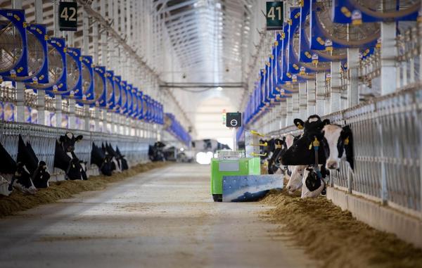 推料机器人在牛舍内工作