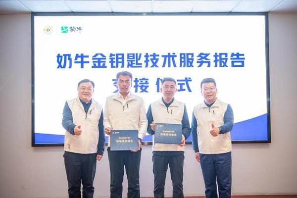 国家奶牛产业技术体系首席科学家、中国农业大学教授李胜利,蒙牛集团奶源事业部总经理程晓飞向牧场移交评估报告
