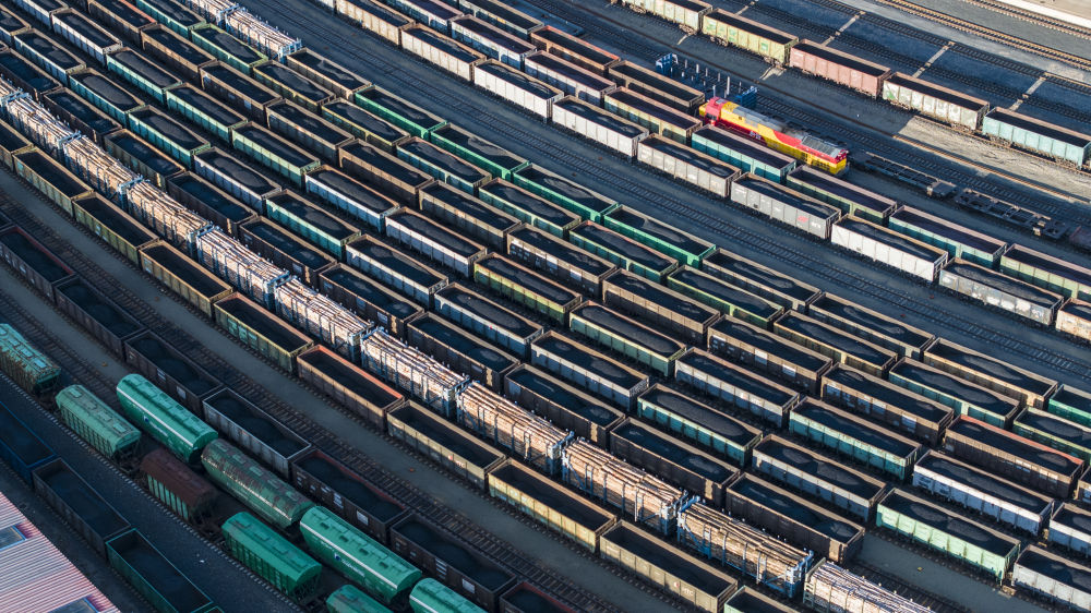 2025年10月18日,在中国铁路哈尔滨局集团有限公司绥芬河站南场,满载进口货物的列车等待解体换装(无人机照片。新华社发(曲艺伟 摄