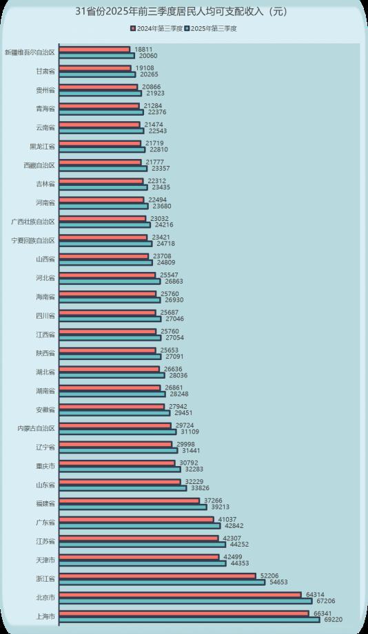 在中国各地居民人均收入版图上,上海和北京双双突破6.5万元大关,遥遥领先其他省份。上海以居民人均可支配收入69220元位居全国榜首,北京以67206元紧随其后。浙江以54653元的成绩位居第三名,与上海、北京共同构成收入的“第一梯队”。