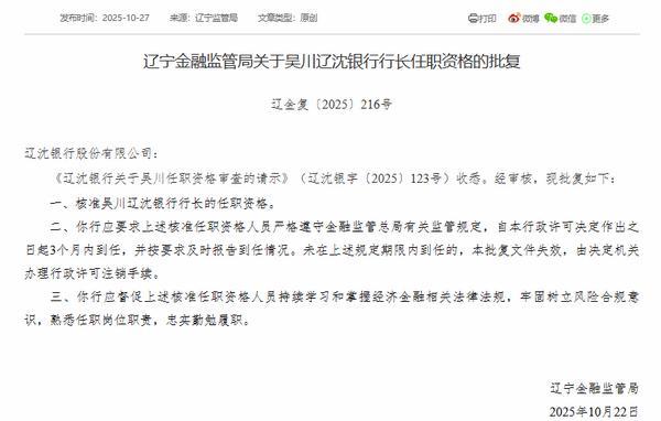 财经10月28日讯 10月27日,辽宁金融监管局公布相关批复显示,核准吴川辽沈银行行长的任职资格。