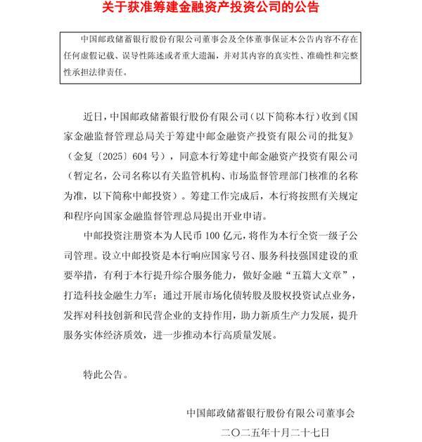 邮储银行:获准筹建中邮金融资产投资有限公司