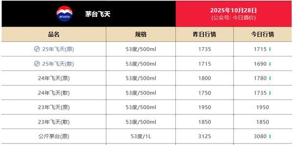 10月28日,据第三方平台“今日酒价”披露的批发参考价显示,25年飞天散瓶(53度/500ml较前一日下跌25元,报1690元/瓶;25年飞天原箱较前一日下跌20元,报1715元/瓶。据了解,这是飞天茅台批发价首次跌破1700元关口,创下历史新低。