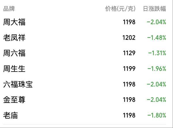 国内黄金饰品克价也多数跌破1200元。10月28日,周大福足金(饰品、工艺品类价格为1198元/克,周生生足金饰品价格为1199元/克,老庙足金饰品价格为1198元/克,老凤祥足金零售价为1202元/克,周六福足金饰品价格为1129元/克。