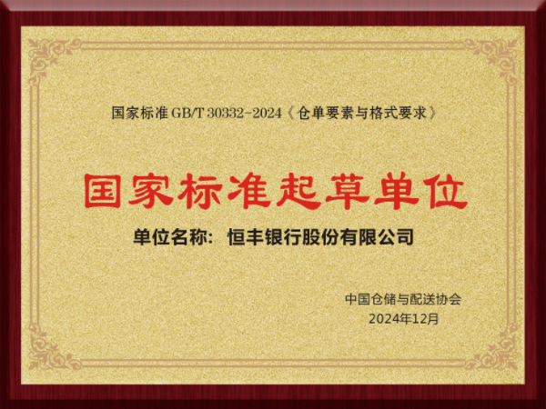 近日,中国仓储与配送协会、中国物资储运协会主办的“第十届中国金融仓储创新发展大会”在贵州遵义召开,恒丰银行被授予“国家标准《仓单要素与格式要求》起草单位”称号。