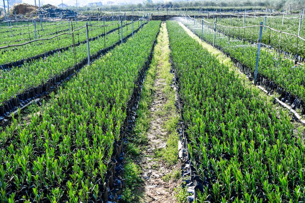 在四川冕宁县元升油橄榄产业园,自动喷淋系统在为培育中的油橄榄树幼苗浇水(2024年12月12日摄。新华社记者 张超群 摄